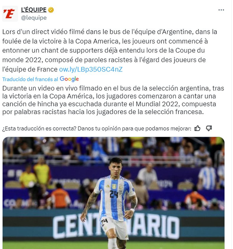 «Patético. Comportamiento que resulta tanto más inaceptable si se repite. FIFA: ¿una reacción?«, expresó en un posteo de X, la Minista de Deportes francesa, Amélie Oudéa-Castéra, al comentar un artículo del diario L’ÉQUIPE, en el cuál espresaron que «los jugadores comenzaron a cantar una canción de hincha ya escuchada durante el Mundial 2022, compuesta por palabras racistas hacia los jugadores de la selección francesa».